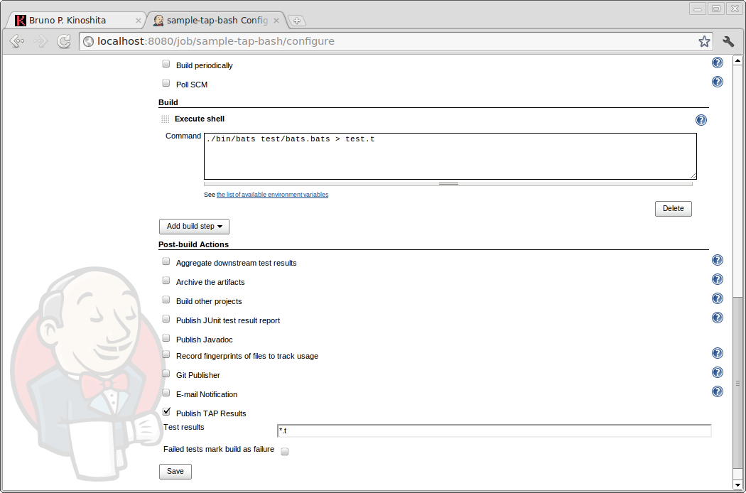 Before executing the build, you have to check the option to publish TAP results in the end of the configuration screen. That’s it. Execute your job, chug the remaining of your beer and now you can go to bed… or just refresh Hacker News and Reddit once more…