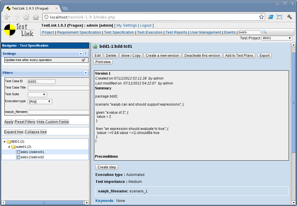 There are many pros and cons in this integration, and a lot of work to do in the existing BDD tools, in TestLink and in the testlink-plugin too. I will write more about it in details later, but here’s a short list of things I’ve noted to work on the integration: